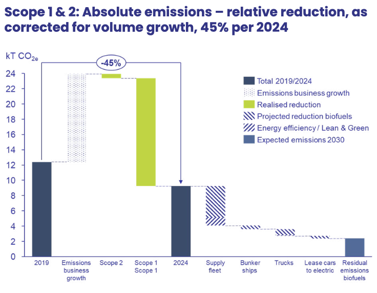 Sinds 2019 daalde onze eigen uitstoot met 45 procent, gecorrigeerd voor volume. We varen en rijden waar mogelijk op biobrandstoffen en passen insetting toe, gebruiken groene stroom, optimaliseren de logistiek met bijvoorbeeld Lean & Green routering en werken volgens de CO₂ Prestatieladder trede 3, handboek 4.0. Restuitstoot in 2030 compenseren we binnen de keten en waar nodig beperkt via offsetting (afhankelijk van ontwikkelingen binnen GHG-accounting methodologie).