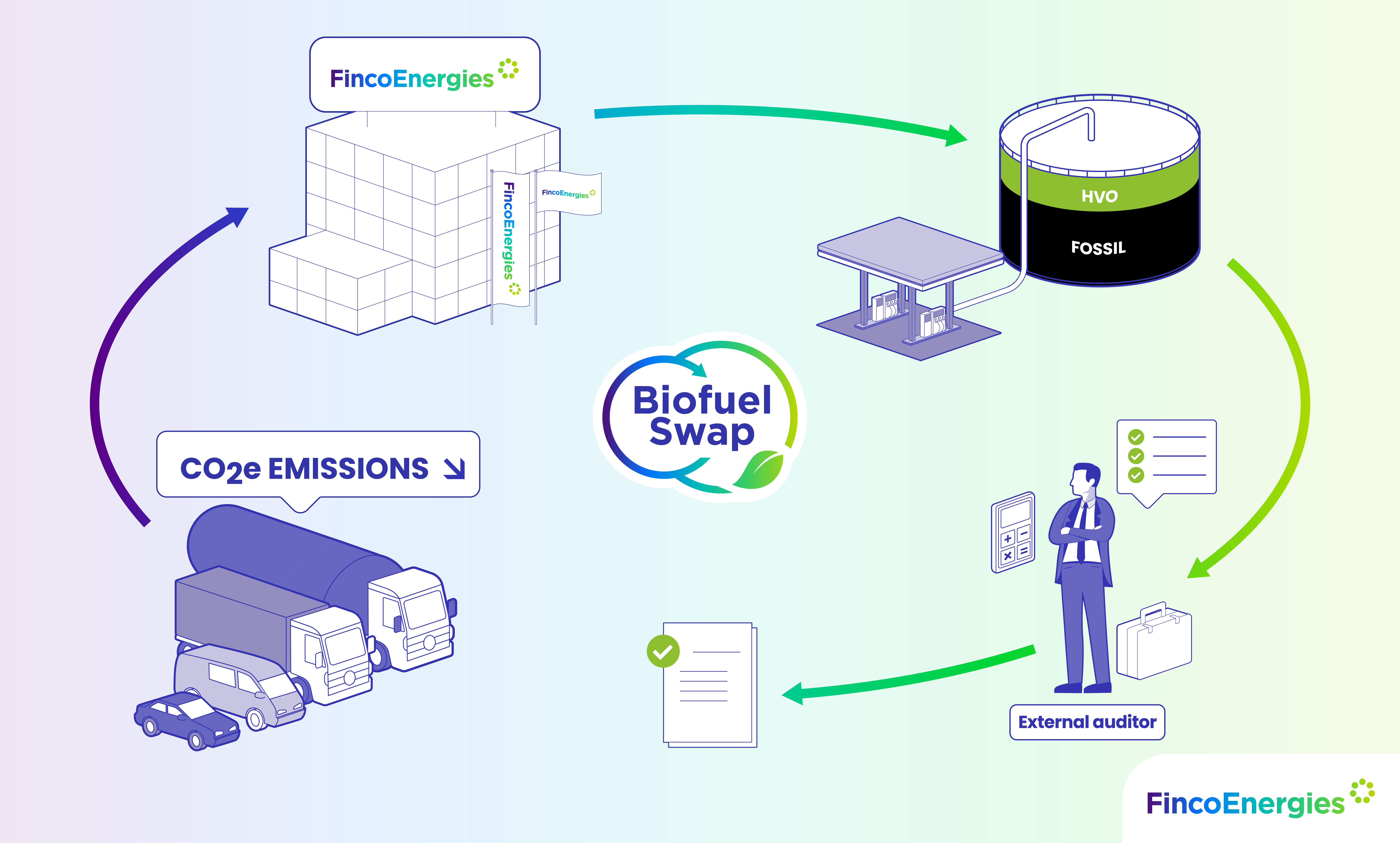Met Biofuel Swap biedt FincoEnergies een praktische oplossing om emissies te verlagen. Organisaties kopen een hoeveelheid HVO100 die aan het Nederlandse wegverkeer wordt toegevoegd, waarna de bijbehorende broeikasgasreductie aan hun eigen operatie kan worden toegerekend.